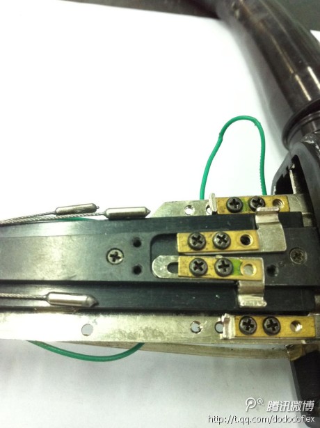操作部的零部件13:富士能软镜的调角度装置。该装置是利用拉杆的原理来实现角度的调整。松开三颗螺丝,把拉杆拉长,角度变小;把拉杆推进去,角度变大。调整完拧紧螺丝。